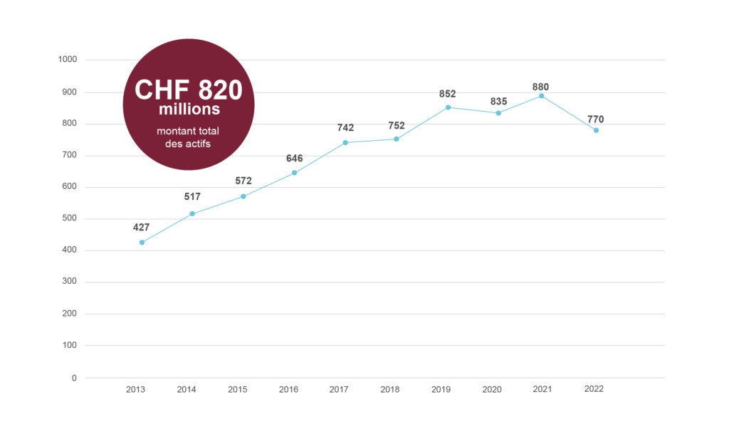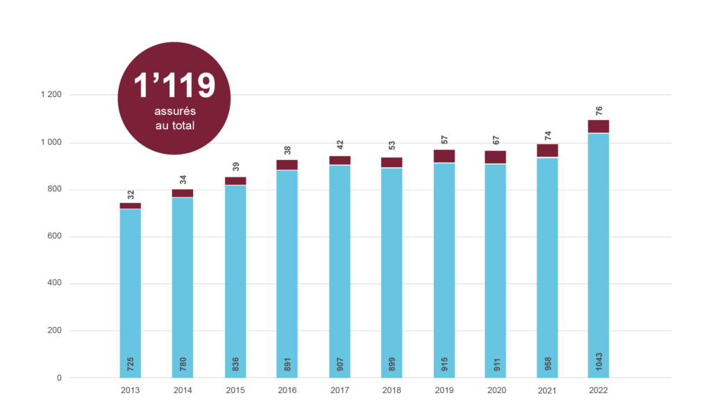 Le nombre d’assurés est en progression avec 1’119 assurés au total (soit 1’043 actifs et 76 bénéficiaires de rentes) au 31.12.2022.