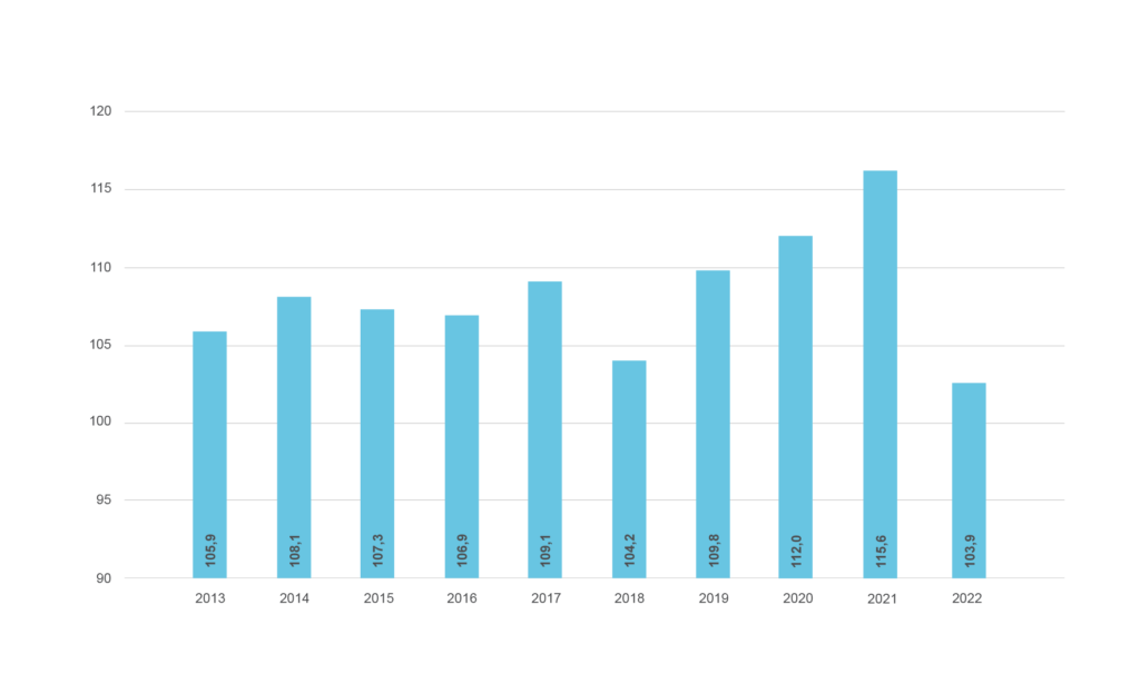 La réserve de fluctuation de valeurs se monte à près de CHF 30 millions au 31.12.2022 (120 millions au 31.12.2021), soit un degré de couverture proche de 104% avec une valeur cible à 15% (soit 105 millions).