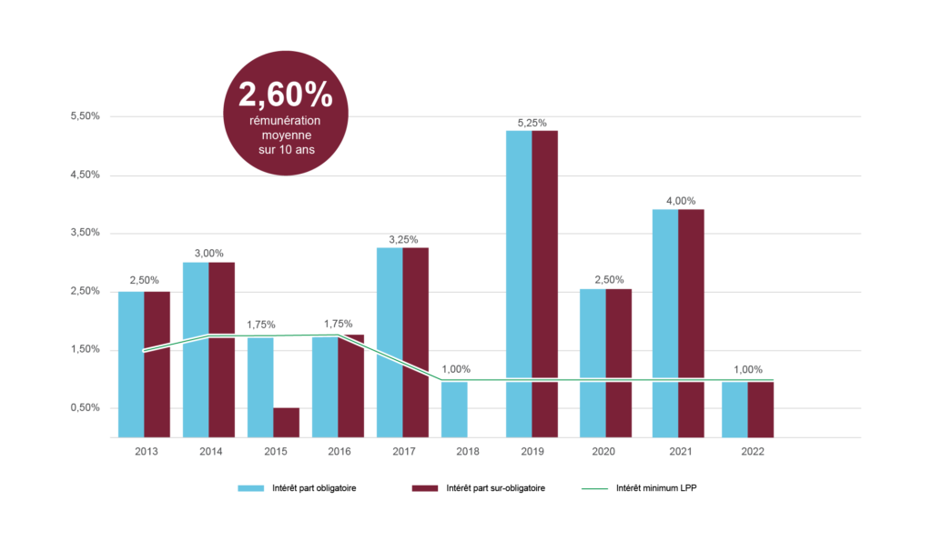 A l’exception des années marquées par un choc boursier (2011, 2015 et 2018), Aromed a toujours crédité votre avoir de prévoyance d’un intérêt supérieur au taux minimum légal et ce sur la totalité de votre fortune.